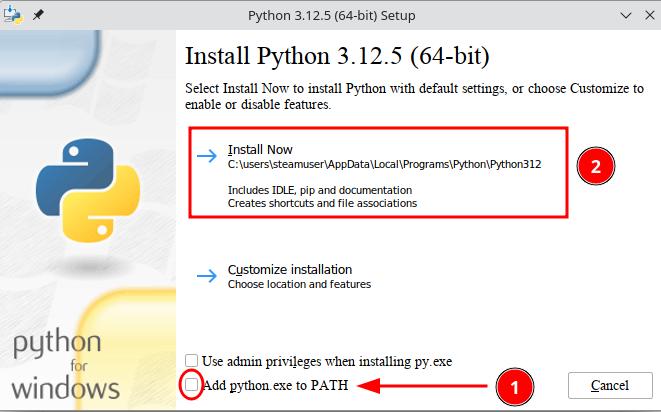 Onder windows ga je naar de python site en download je de laatste versie voor windows. Dan het gedownloade bestand uitvoeren en BELANGRIJK, zorg dat je op het eerste scherm de optie aanvinkt dat hij de PATH variabelen moet toevoegen!
